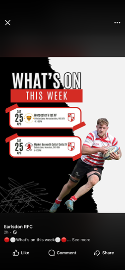 Earlsdon First XV finish off their Counties 1 season on Saturday with a coach trip to league champions Worcester RFC. It's been a tough season fir the lads after gaining promotion last season but overall Coach Jon Fitt and the lads have done well and will finish around mid table. Kick Off 3pm.